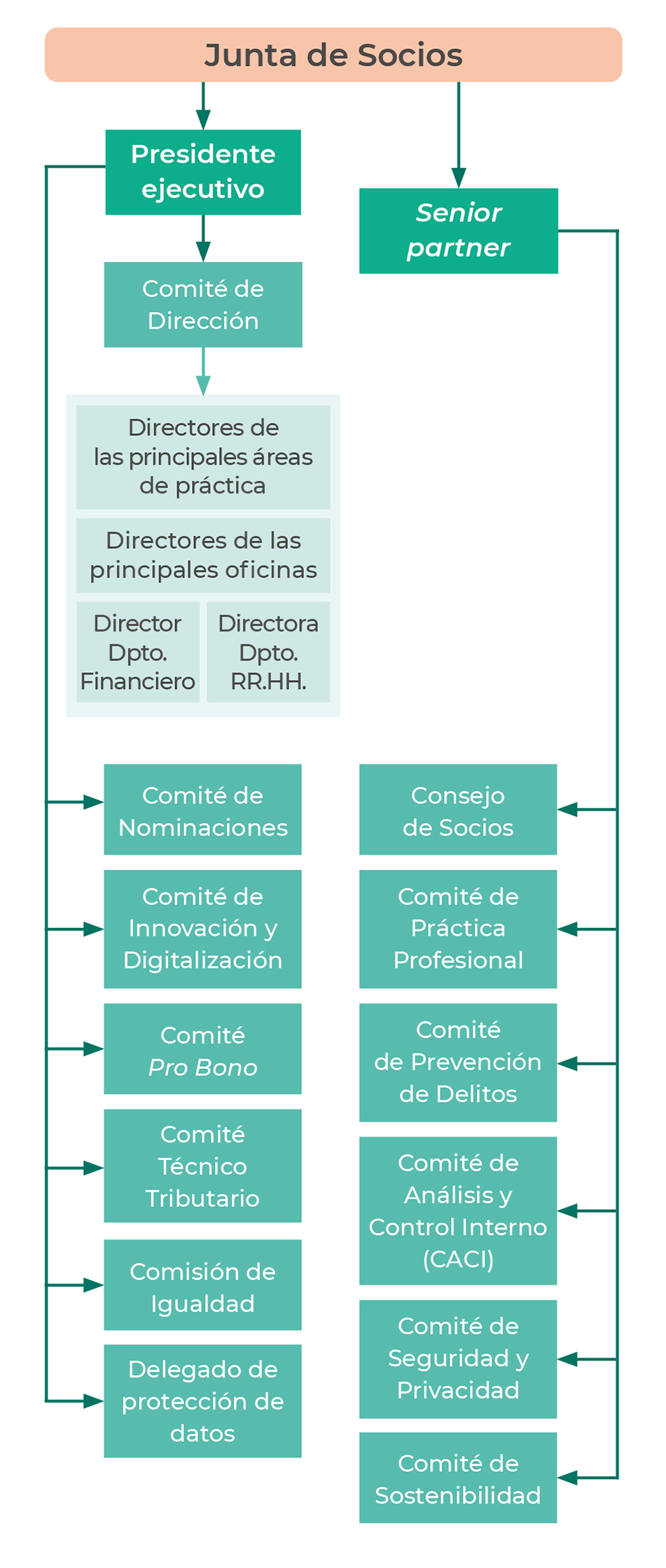 La senior partner del despacho es Rosa Zarza. Tiene conferidas, entre otras, funciones de supervisión, apoyo e información al presidente ejecutivo; informa y eleva a la Junta de Socios propuestas sobre el gobierno corporativo del despacho; cuida de la correcta aplicación de las medidas previstas en el Programa para la Prevención de Delitos y de la política establecida en materia de prevención de blanqueo de capitales; gestiona los conflictos jurídicos de intereses y vela por la salvaguarda de la identidad reputacional de la firma. En el ejercicio de sus funciones, la senior partner cuenta con el apoyo y preside el Consejo de Socios y se apoya en otros órganos consultivos.
